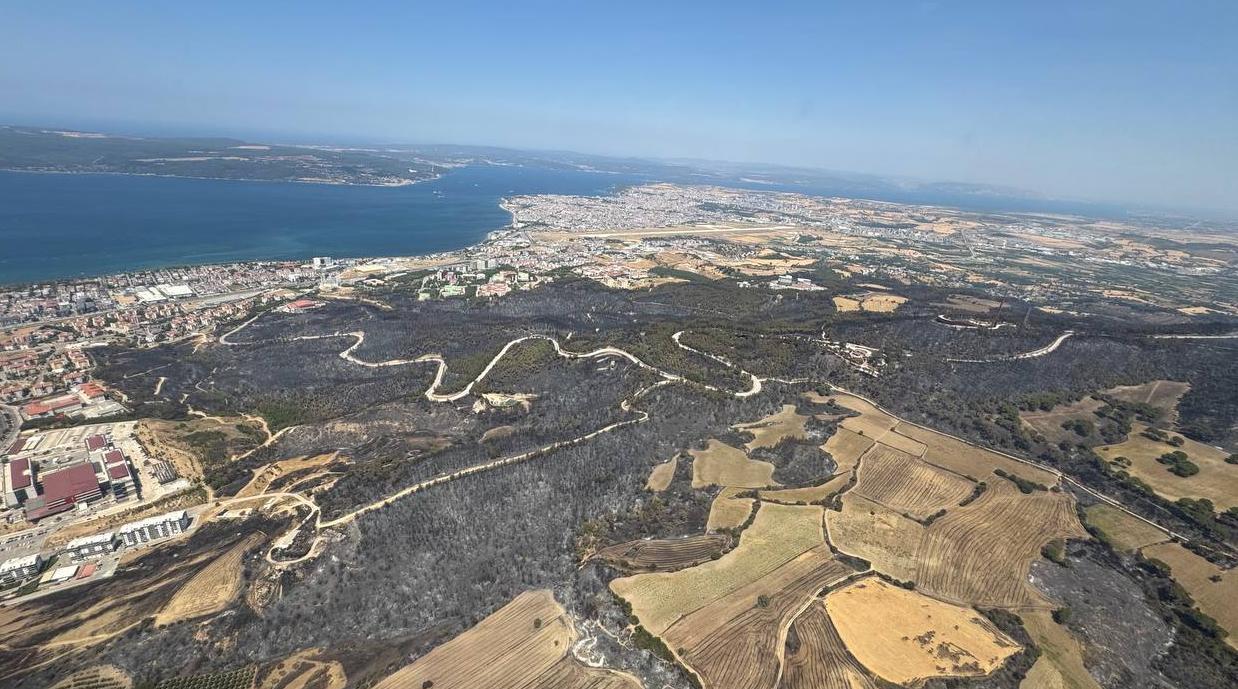 Çanakkale merkez ve Bayramiç ilçesinde çıkan ve büyük ölçüde kontrol altına alınan yangından etkilenen ormanlık alan helikopterden görüntülendi.