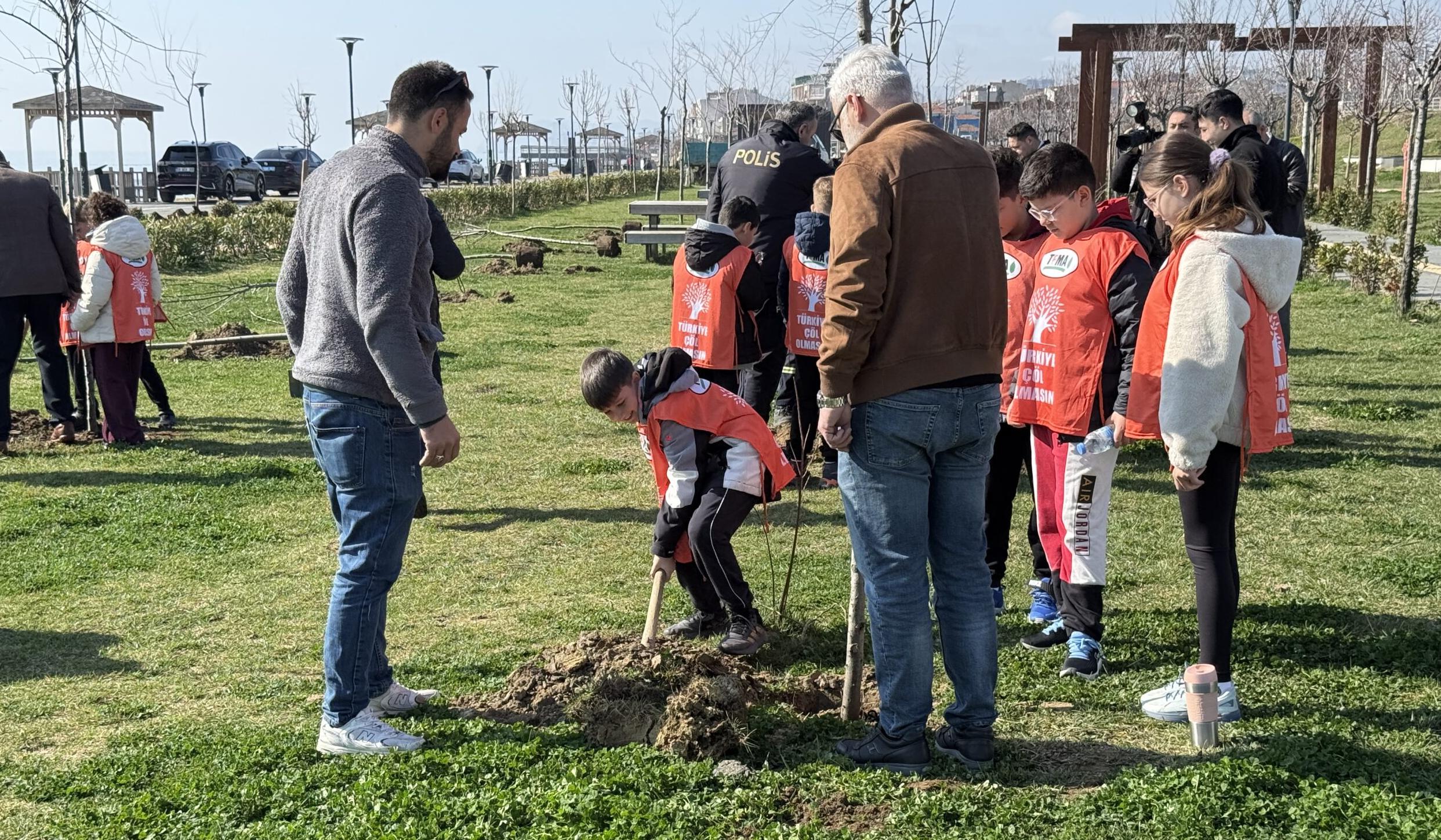Konuşmaların ardından ilkokul öğrencileri ve protokol üyeleri fidanları dikti.