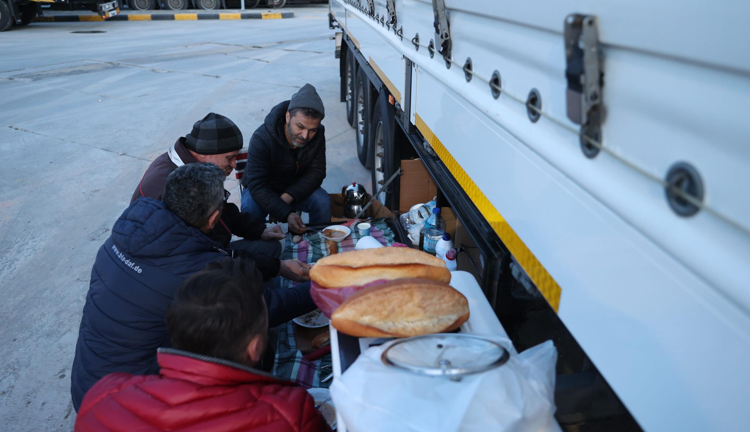 Araçlarının dolaplarına koydukları yiyeceklerle meslektaşlarıyla sofra kuran tır şoförleri, oruçlarını hep birlikte açıyor. İhracata katkıda bulunan tır şoförleri, ramazanı da ailelerinden uzakta geçiriyor.