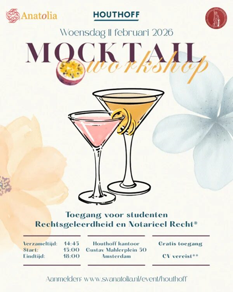 SV Anatolia, Amsterdam’daki Houthoff hukuk bürosunda düzenlenecek bir mocktail atölyesine sizi davet ediyor. Tüm hukuk öğrencileri için bu, avukatlarla tanışmak ve onların çalışma ortamına yakından bakmak açısından keyifli ve eşsiz bir fırsat sunuyor…