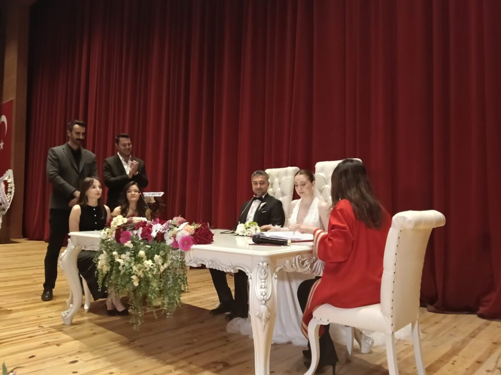 Genç çiftin nikah töreni, Edirne Belediyesi Atatürk Kültür Merkezi’nde gerçekleşti. Törene çok sayıda davetli katılarak genç çiftin bu özel gününe tanıklık etti. Ecem ve Ekin çifti, nikah masasında “evet” diyerek bir ömür boyu sürecek mutluluğa adım attı. Nikahın ardından davetliler, çifti tebrik ederek mutluluk diledi.