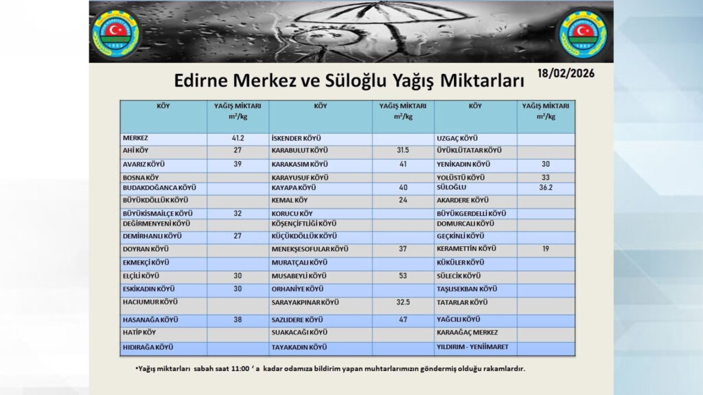 Edirne Ziraat Odası Başkanlığı, bazı köyler ve merkezde yağış miktarı verilerini açıkladı. Buna göre en çok yağış metrekareye 53 kilogram ile Musabeyli köyüne düştü. Metrekareye 47 kilogram yağış alan Sazlıdere köyü ise en çok yağış alan ikinci köy oldu.