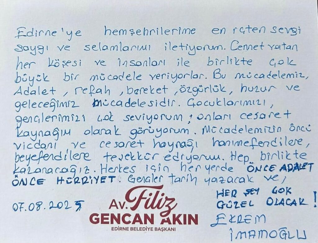 İmamoğlu Edirnelilere yazdığı mesajda şunları kaydetti: