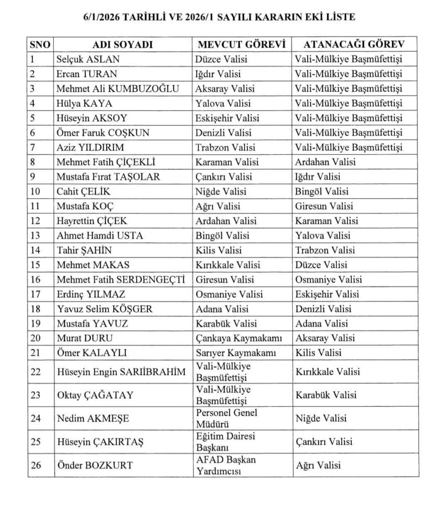 Valiler kararnamesi Resmi Gazete’de yayımlandı. 7 vali merkeze çekilirken, 12 valinin görev yeri değişti. Görev yeri değişen valiler arasında Edirne Valisi Yunus Sezer yer almadı.