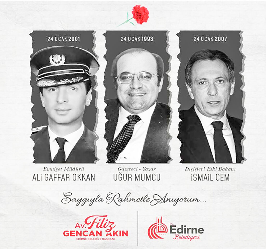 Edirne Belediye Başkanı Av. Filiz Gencan Akın, ayrıca 24 Ocak 2001’de hain bir saldırı sonucu şehit düşen Diyarbakır Emniyet Müdürü Ali Gaffar Okkan’ı ve 24 Ocak 2007’de vefat eden eski Dışişleri Bakanı, siyasetçi ve gazeteci İsmail Cem’i de saygı ve rahmetle andıklarını belirtti. Haber Merkezi